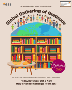 Celebrate gratitude, global connection, and Big Orange pride at Global Gathering of Gratitude, hosted by the Graduate Student Senate in honor of International Education Week! This festive gathering blends the spirit of giving with the diversity of cultures that make our Volunteer community so special. Join fellow Vols for an evening filled with cozy vibes and catering from Yassin’s Falafel House. Whether you come to connect or to celebrate the season, this event is the perfect way to honor both the Volunteer spirit and the global community we are proud to call home. 🌍
